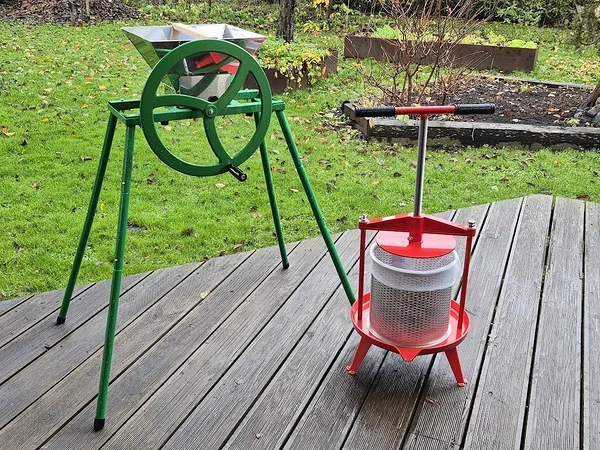Käsikäyttöinen murskain ja 14 litran ruuvipuristin sopivat erinomaisesti sinulle, jolla on muutama omenapuu ja joka haluaa puristaa omenoita mehuksi noin 20–30 litran erissä useamman kerran omenasadon aikana.
